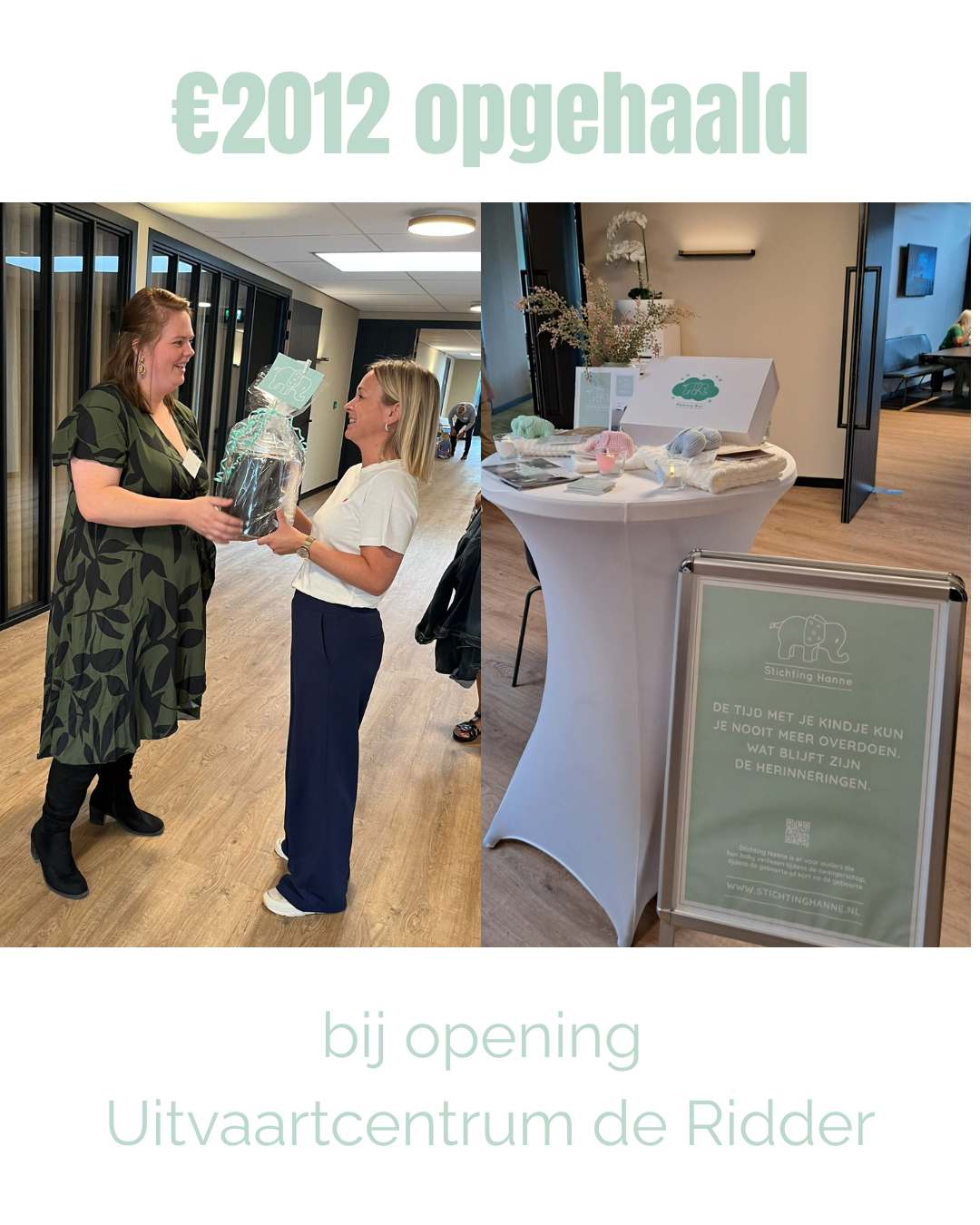 30 augustus mochten wij als stichting aanwezig zijn bij de opening van het nieuwe pand van Uitvaartverzorging de Ridder. Natuurlijk brachten wij een cadeautje mee om hen te feliciteren, maar het grootste cadeau gaven zij aan ons. Ze vroegen namelijk iedereen die hen graag iets wilde geven ter felicitatie dit te doen in de vorm van een donatie aan Stichting Hanne. Zo hebben wij inmiddels €2012 mogen ontvangen. Wij willen iedereen die gedoneerd heeft natuurlijk hartelijk bedanken. Ons grootste dankjewel gaat naar Uitvaartcentrum de Ridder. Bedankt! Namens ons en alle ouders die we hiermee weer een mooie memorybox kunnen schenken.